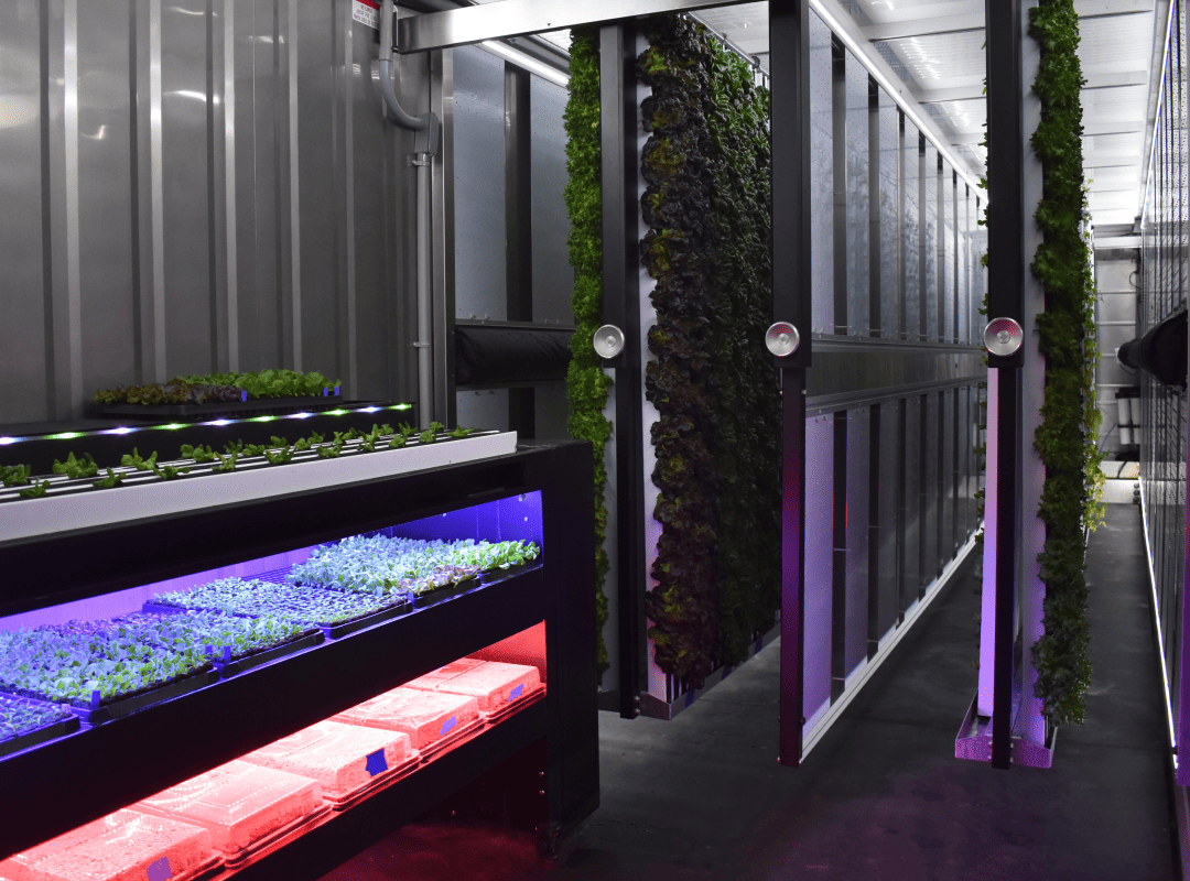 This shipping container growing environment is a turnkey system for growing lettuce, greens, herbs, small root vegetables, and flowers.