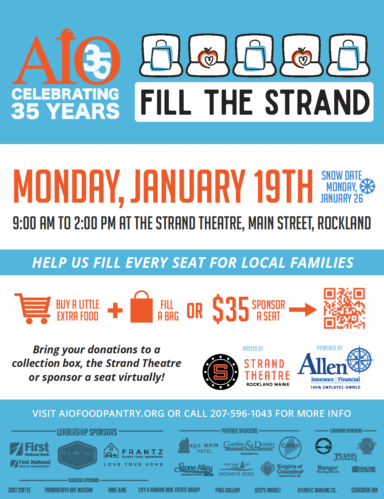 Fill The Strand is Rockland’s signature winter fundraising event. This is a critical fundraiser to help AIO provide services during the most challenging time of the year. Funds raised help to provide heating assistance and purchase food for our market, and food donated provides a much-needed boost in food variety and availability. For the more than 400 families who now rely on AIO for food assistance each week, the Fill The Strand event is essential to sustaining the high level of service, help, and dignity AIO provides.