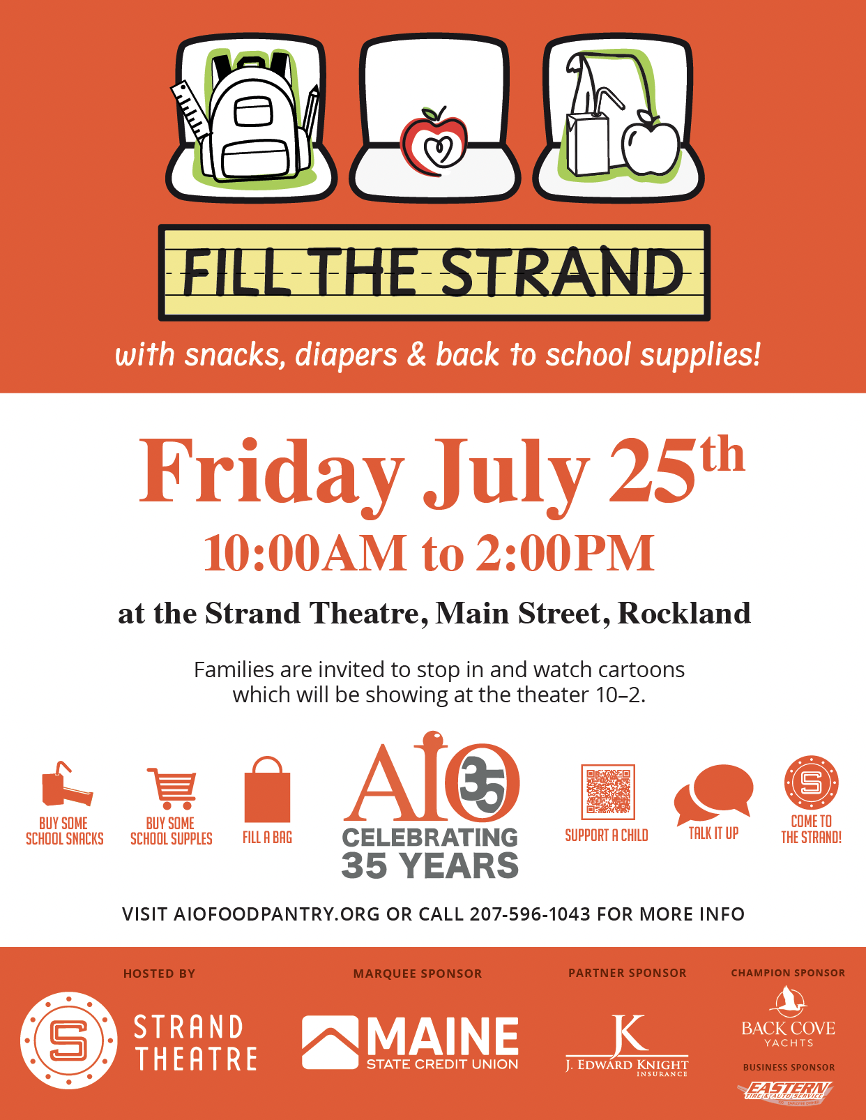 On Friday, July 25 AIO staff and volunteers will be at the Strand Theatre from 10:00am–2:00pm to accept school snacks, diapers, school supplies and financial donations. Drive-up and drop-off service will be available or come in the Strand Theatre, located at 345 Main Street, Rockland. AIO is proud to partner with two business leaders who are instrumental in making this event possible—The Strand Theatre who hosts the annual Fill the Strand winter event and Maine State Credit Union who has a long tradition of giving back to those in need in the community.